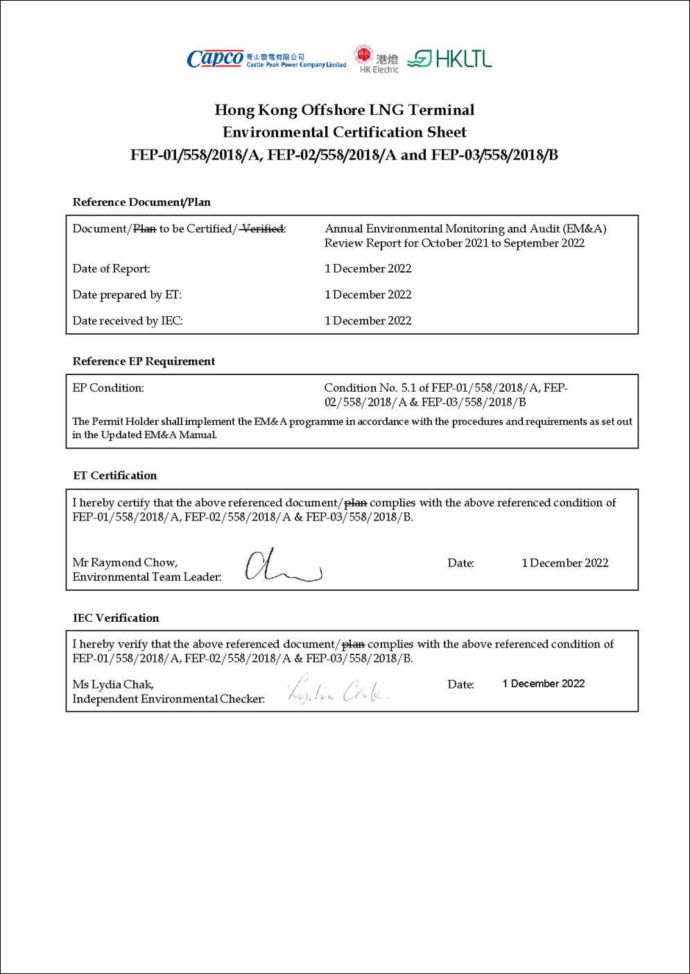 §  the double berth jetty at LNG Terminal under the Hong Kong LNG Terminal Limited (HKLTL), joint venture between CAPCO and HK Electric (FEP-01/558/2018/A) – construction commenced on 27 November 2020;
