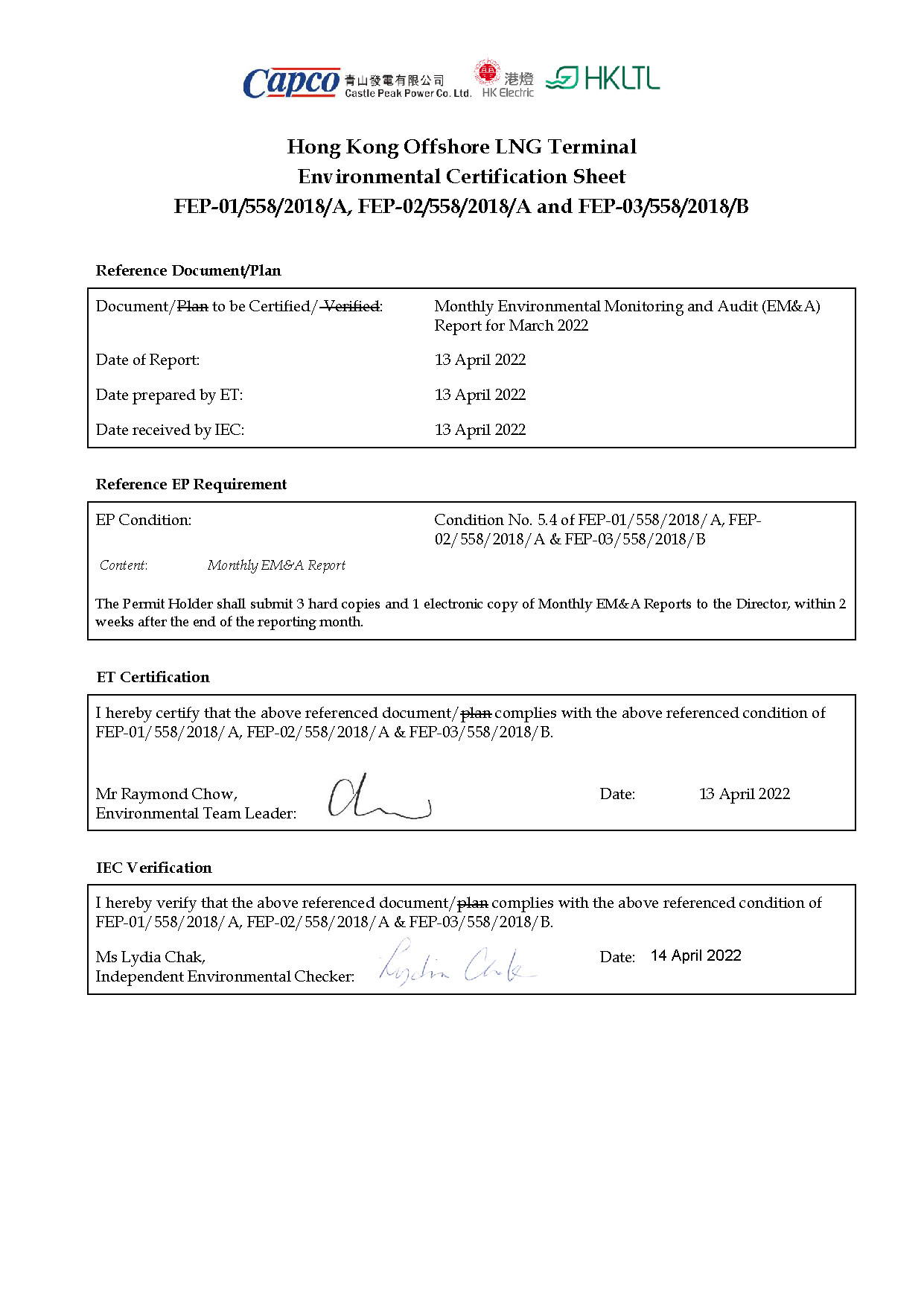§ the double berth jetty at LNG Terminal under the Hong Kong LNG Terminal Limited (HKLTL), joint venture between CAPCO and HK Electric (FEP-01/558/2018/A) – construction commenced on 27 November 2020;