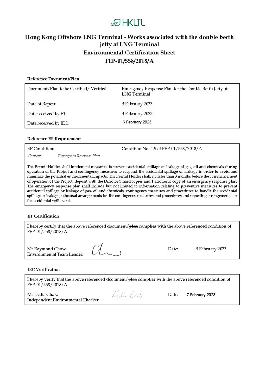 FEP No. FEP-01/558/2018/A, Condition 4.9: “The Permit Holder shall implement measures to prevent accidental spillage or leakage of gas, oil and chemicals during operation of the Project and contingency measures to respond the accidental spillage or leakage in order to avoid and minimize the potential environmental impacts. The Permit Holder shall, no later than 3 months before the commencement of operation of the Project, deposit with the Director 3 hard copies and 1 electronic copy of an emergency response plan. The emergency response plan shall include but not limited to information relating to preventive measures to prevent accidental spillage or leakage of gas, oil and chemicals, contingency measures and procedures to handle the accidental spillage or leakage, rehearsal arrangements for the contingency measures and procedures and reporting arrangements for the accidental spill event.” |