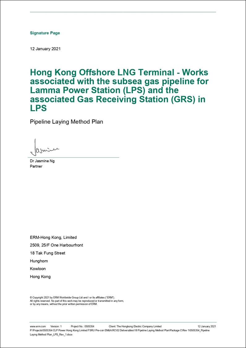 The Environmental Impact Assessment (EIA) Report for the Hong Kong Offshore LNG Terminal Project was submitted to the Environmental Protection Department (EPD) of the Hong Kong Special Administrative Region Government in May 2018. The EIA Report (EIAO Register No. AEIAR-218/2018) was approved by EPD and the associated Environmental Permit (EP) (EP-558/2018) was issued in October 2018. An application for Further Environmental Permits (FEP) were made on 24 December 2019 to demarcate the works between the different parties. The following FEPs were issued on 17 January 2020 and the EP under EP-558/2018 was surrendered on 5 March 2020: