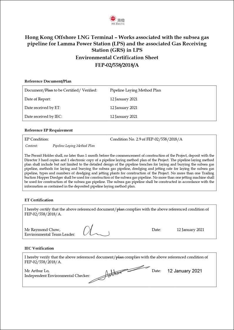 FEP No. FEP-02/558/2018/A, Condition 2.9: “The Permit Holder shall, no later than 1 month before the commencement of construction of the Project, deposit with the Director 3 hard copies and 1 electronic copy of a pipeline laying method plan of the Project. The pipeline laying method plan shall include but not limited to the detailed design of the pipeline trenches for laying and burying the subsea gas pipeline, methods for laying and burying the subsea gas pipeline, dredging and jetting rate for laying the subsea gas pipeline, types and numbers of dredging and jetting plants for construction of the Project. No more than one Trailing Suction Hopper Dredger shall be used for construction of the subsea gas pipeline. No more than one jetting machine shall be used for construction of the subsea gas pipeline. The subsea gas pipeline shall be constructed in accordance with the information as contained in the deposited pipeline laying method plan.” |