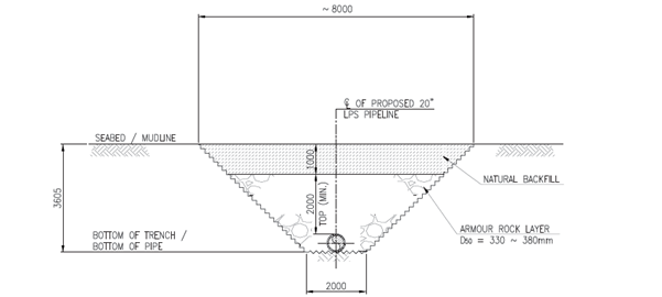 The proposed subsea gas pipeline for the LPS (‘LPS Pipeline’) will connect the LNG Terminal with the GRS at the LPS and is approximately 20 inches (20”) in diameter and 18km in length. It is a requirement that all subsea pipelines in HKSAR waters must be buried below the seabed. Burial depth when considered with rock armour provides the required level of pipeline protection. The actual burial depth below seabed is dependent on the marine and subsoil conditions along the pipeline routes. For areas that are considered to pose a threat to the integrity of the pipeline through anchor drop/drag, additional protective measures are required such as rock armour placement. The pipelines would be externally coated with an anti-corrosion coating and would also be concrete weight coated. Based on the latest engineering development, two types of pipeline trench designs (Type 4 and Type 5) have been developed to provide the range of pipeline protection required for the LPS Pipeline. The detailed design for the two trench types are provided in Figure 2.1 and Figure 2.2, respectively, and is described below: